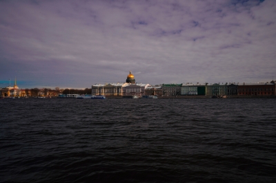 Вид на Исаакиевский собор со стороны Университетской набережной, река Нева