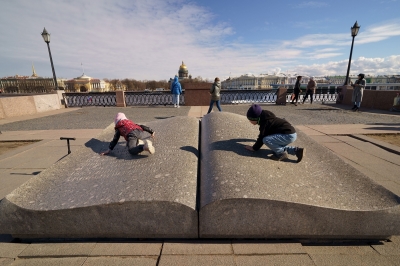 Памятный знак об Исаакиевском наплавном мосте в Санкт-Петербурге, открытая книга, памятник