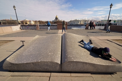 Памятный знак об Исаакиевском наплавном мосте в Санкт-Петербурге, открытая книга, памятник