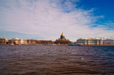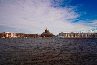 Вид на Исаакиевский собор со стороны Университетской набережной, река Нева