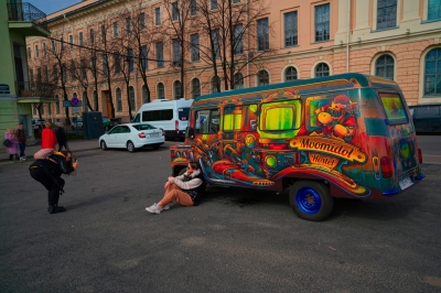 Фотография Фото девушек возле разрисованного автобуса — фотосток InfoPhoto.ru